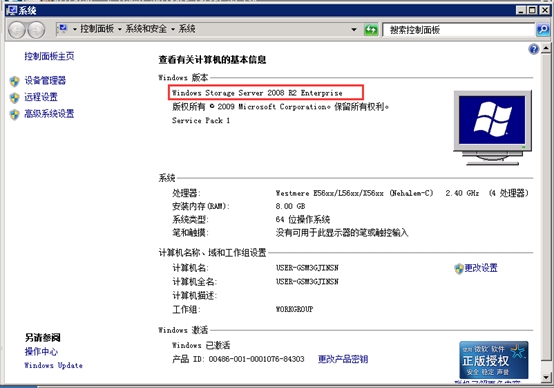 我的電腦右鍵點擊屬性,發(fā)現(xiàn)系統(tǒng)已變成Windows Storage Server 2008 R2,成功將Windows Server 2008 R2轉換。