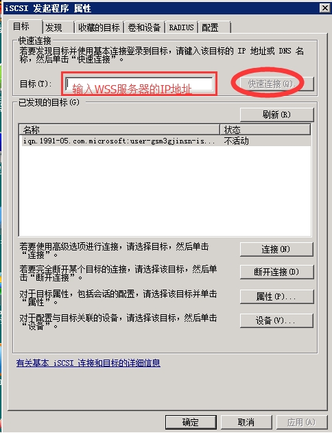 打開ISCSI 配置界面,在目標中輸入WSS服務器的IP地址,然后點擊"快速連接",當連接成功后完成后續(xù)配置。