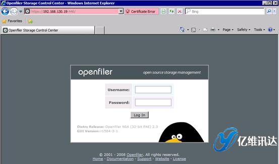 Openfiler 鏡像系統(tǒng)配置當(dāng) Openfiler 系統(tǒng)安裝并重啟完成后,對系統(tǒng)所有后續(xù)的配置過程,都是以 Web 方式配置完成的。這種全部基于 Web 的系統(tǒng)配置方式,使得配置過程變得更加簡易,同時也帶來了良好的用戶體驗。首先打開瀏覽器,輸入地址:https://IP:446。注意,此處輸入的 IP 地址為在系統(tǒng)安裝時所配置的固定 IP 地址。然后使用系統(tǒng)初始默認(rèn)的用戶名和密碼進行登陸。用戶名為 openfiler,密碼為 password。系統(tǒng)初始的用戶名和密碼可以在第一次登入系統(tǒng)后進行重新設(shè)置。如圖所示。