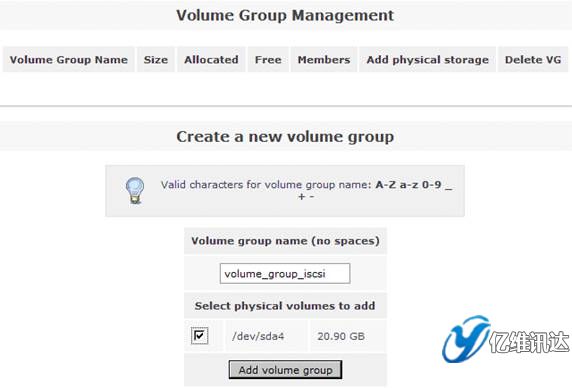 接著在右側(cè)的“Volumes section”區(qū)域選擇“Volume Groups”來創(chuàng)建一個卷組。在區(qū)域“Create a new volume group”處填寫卷組 volume group 的名稱為“volume_group_iscsi”,同時勾選剛剛在上一步所創(chuàng)建的物理卷 /dev/sda4,最后點擊“Add volume group”。如圖