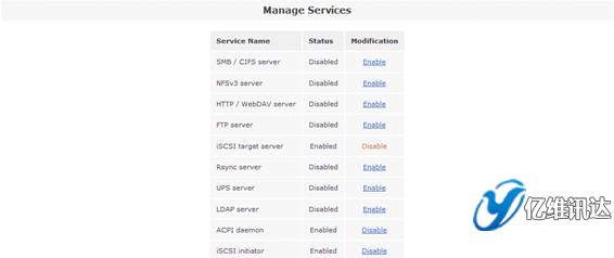 當(dāng) iSCSI 卷創(chuàng)建完成后,接下來是開啟“iSCSI target server”系統(tǒng)服務(wù)。點擊“Services”菜單,在右側(cè)的“Services section”區(qū)域選擇“Manage Services”。然后將系統(tǒng)服務(wù)列表中的“iSCSI target server”設(shè)置為“Enabled”狀態(tài),從而使得系統(tǒng)能夠?qū)ν馓峁┗?iSCSI 協(xié)議的虛擬存儲服務(wù)。如圖