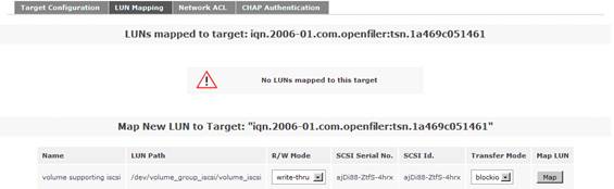 接下來點擊“LUN Mapping”子菜單,保持其余默認(rèn)選項,點擊“Map”選項。從而實現(xiàn)從 LUN 到剛剛配置好的 iSCSI Target 之間的映射。如圖