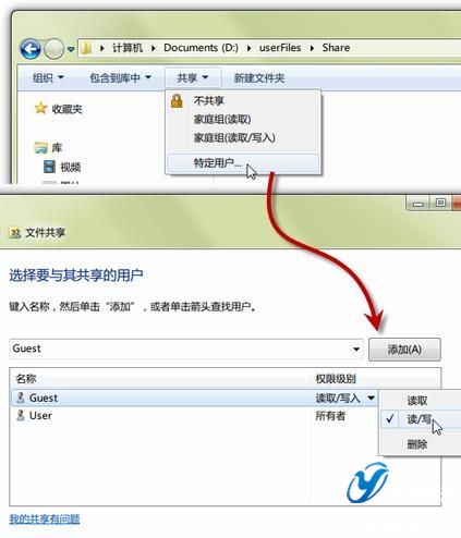 上述設置完畢,即可在Windows 7下開啟某個文件夾的共享功能,使得Mac電腦可以讀取甚至寫入文件的目的。打開需要共享的文件夾——在窗口上方的“共享”下拉菜單中點擊“特定用戶…”——在彈出的選項窗總添加“Guest”,并將權(quán)限級別進行相應設置。
